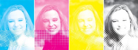 cyan + magenta + yellow + black = final picture 4 color offset printing requires making four printing 'plates'. The plates are generally thin aluminum sheets, but plastic sheets are sometimes used. Each plate prints only one color. The colors are cyan, magenta, yellow, and black. The image on each of the plates is made up of dots. The number of dots per inch will vary depending on the quality of paper and the type of printing press. Newspapers will print with only about 85 to 100 lines per inch. The Needlework Retailer is printed at 175 lines per inch. This "dots per inch" or "lines per inch" is probably the most confused term in printing. The reason it is confusing is because it is sometimes used to refer to both the photo and to the printed piece. It should only be used to refer to the PRINTED piece. The main thing to remember is this: you need more pixels (or 'dots') in the image than you have in the printed picture. The rule of thumb is that the pixels per inch should be twice the lines per inch for the best results. The size of the dot on the printing plate determines how dark or light the color prints. The 4 colors are printed separately. This is done by either running the paper through a printing press 4 times, or (more commonly) running on a 4 color press. A 4 color press is basically 4 printing presses lined up in a row so the piece of paper travels from press to press. Notice that the angle of the row of dots is different in each of the 4 colored plates above. This is done because it would be impossible to exactly line up 4 dots one on top of the other. Rotating the angle of the rows allows the printing to be slightly out of alignment and still produce a high quality picture. Because the dots on the printing plate do not align exactly with the dots in the digital image, the program that creates the printing plate must guess at the true color value for each printed dot on the plate by looking at multiple surrounding dots (pixels) in the digital image. In other words, for each dot on the printing plate, the program will use several pixels in the digital photo to estimate what the correct color is. Because of this averaging, the original digital photo needs more pixels than the printed picture has dots. The pixels per inch is more important for pictures with fine detail. A low ppi will effect the crispness of the printed picture. For example, suppose the only photo you have will be at 200 ppi. If the photo has large areas of more or less solid colors, the results will be reasonably good. But if the photo has fine detail (a cross stitch sampler, for example), the result will be only fair. TriviaHere is additional information that you may find helpful or interesting. CMYK vs. RGB. CMYK stands for cyan, magenta, yellow, and black; the 4 colors for most offset printing. RGB stands for red, green, and blue. The image from your digital camera or scanner will be RGB. If you use the image for the web, you must use RGB because computer monitors only display RBG. If you print on a desktop printer, RGB is fine. Images printed in 4 color offset must be CMYK. If you send us an RGB image for use in the Needlework Retailer, we will convert to CMYK. The cyan of CMYK (which is sort of blue) does not correspond to blue in RGB. And magenta (which is sort of red) does not correspond to red in RGB. RGB are 'additive' colors and CMYK are 'subtractive' colors. A object appears a certain color because part of the light that hits it is absorbed (subtracted). Cyan ink appears cyan because it absorbs red light. Magenta absorbs green light, and Yellow absorbs blue light. In a way, CMY is the reverse of RGB. Now what about K, or black? In theory, black should not be necessary. You should be able to print with only CMY (cyan, magenta, and yellow). In practice, you would get a very muddy looking picture because the inks are not perfect colors. Your computer program that converts from RGB to CMYK will convert some of the color to black. Gray is equal parts of R, G, and B; which would convert to equal parts C, M, and Y. The program will remove some of C, M, and Y and replace them with black. Why did they use the letter K for black? The most common reason given is that K stands for 'key', since black was used as a registration mark; but all four colors have registration marks. My guess is that K was chosen partly to avoid confusion; there isn't a color that starts with K.
