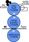 The plate continues on around to the ink rollers. The ink has oil in it. The oily ink will not stick to the wet part of the plate. The dry part of the plate will accept the ink. The plate continues to the offset blanket cylinder. The offset blanket is a smooth sheet of rubber. The ink offsets from the printing plate onto the offset blanket. This is why is it called offset printing. The offset blanket cylinder continues on around until it transfers the ink onto the paper, very similar to a rubber stamp. This happens very quickly. A printing press will run at 3,000 to 15,000 impressions per hours, with high speed presses running at up to 50,000 impressions per hour.