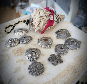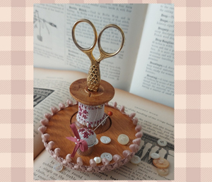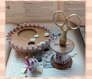 Fabric, Pom Pom trim, Thimble, and Wooden base and Wooden bobbin.