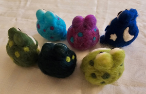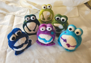 Cost: $25 class fee + $22 supplies (needles & holders, leather finger cots, felting block, t-pins, body & eye bases and your color choice of wool roving to complete your frog).